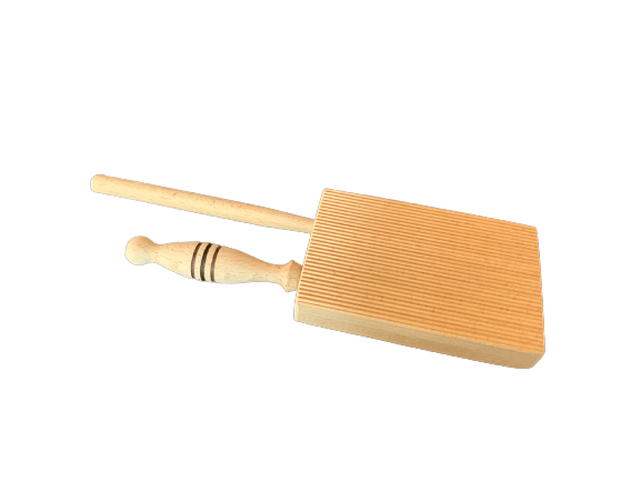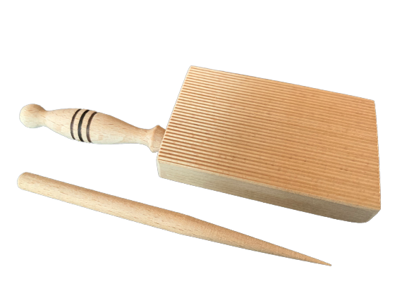 Régi időket idéző, nagyanyáink által is használatos csigatészta vagy lúdgége tészta készítő. A barázdált deszka méretei 9,5 x 6 x 2 cm,pici 1 cm-es lábak segítik a tábla ejtését. A hegyesre keskenyített pálca hossza 15 cm. Az olasz gnocchi tészta készítésére is alkalmas.